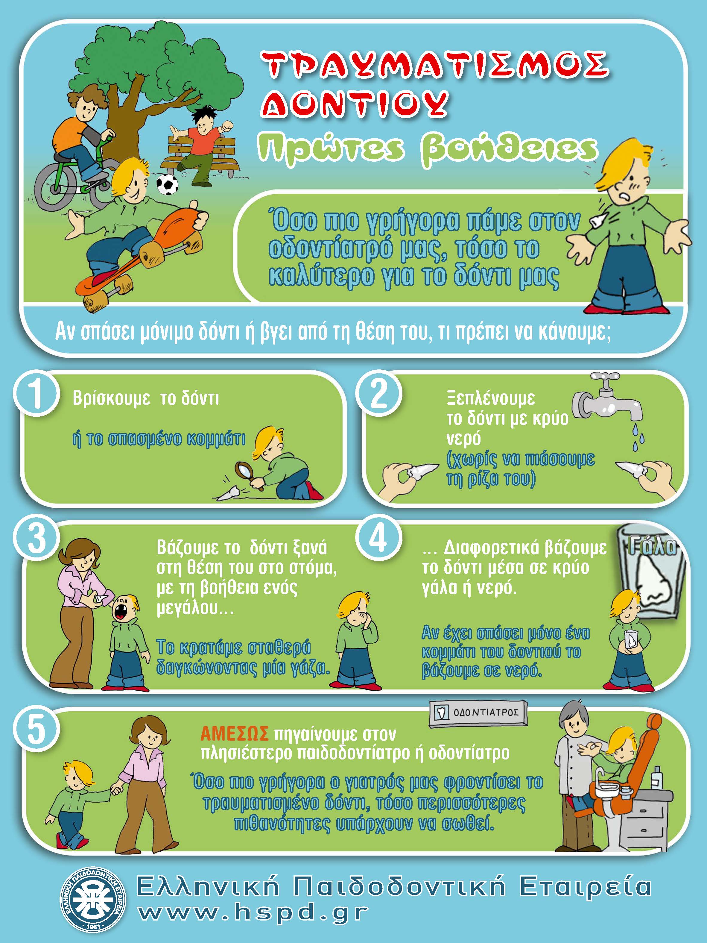 Εάν το δόντι σπάσει και μπορέσετε να βρείτε το σπασμένο κομμάτι, διατηρείστε το σε νερό και επισκεφθείτε τον Παιδοδοντίατρο.